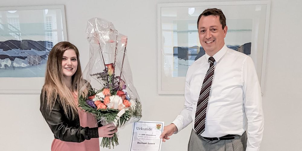 Während mehreren Jahren zählte unser Dorf zwischen 3900 und 3950 Einwohnerinnen und Einwohner. Nachdem es in den letzten Monaten zu einer erhöhten Bautätigkeit kam, konnte der Gemeindepräsident Dr. Thomas A. Müller im Mai 2021 mit Frau Laura Dottori die 4000. Einwohnerin im Dorf willkommen heissen und ihr bei dieser Gelegenheit eine Urkunde und einen schönen Blumenstrauss überreichen.