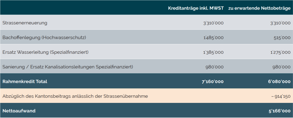 Da sich die Subventionen im Bereich Hochwasserschutz auf 65% der effektiven Kosten belaufen und auch im Bereich der Wasserleitung ein Beitrag von der SGV zu erwarten ist, belaufen sich die Netto Kosten insgesamt auf CHF 6,08 Mio Berücksichtigt man dazu noch die vom Kanton erhaltene Beteiligung für die Instandstellung des Belags von CHF 914’150, belaufen sich die tatsächlich durch die Gemeinde zu tragenden Kosten auf rund CHF 5,166 Mio.