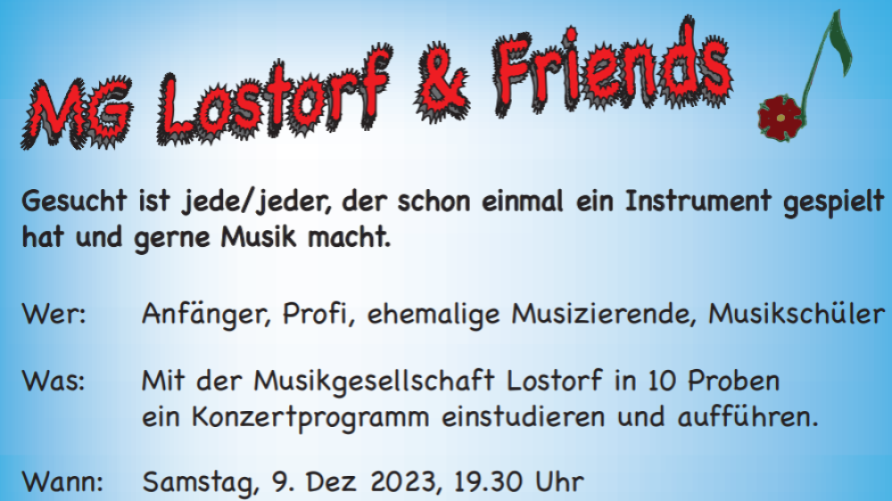 Mit dem Projekt MG Lostorf & Friends möchten wir alle einladen, die ein Instrument spielen, an unserem Jahreskonzert mitzuwirken. Egal ob AnfängerInnen oder Profis, MusikschülerInnen oder ehemalige MusikantInnen – Hauptsache, man hat Freude an der Musik. Ziel ist es, in 10 Proben gemeinsam ein abwechslungsreiches Konzertprogramm einzustudieren und am 9. Dezember 2023 an unserem traditionellen Jahreskonzert aufzuführen.
