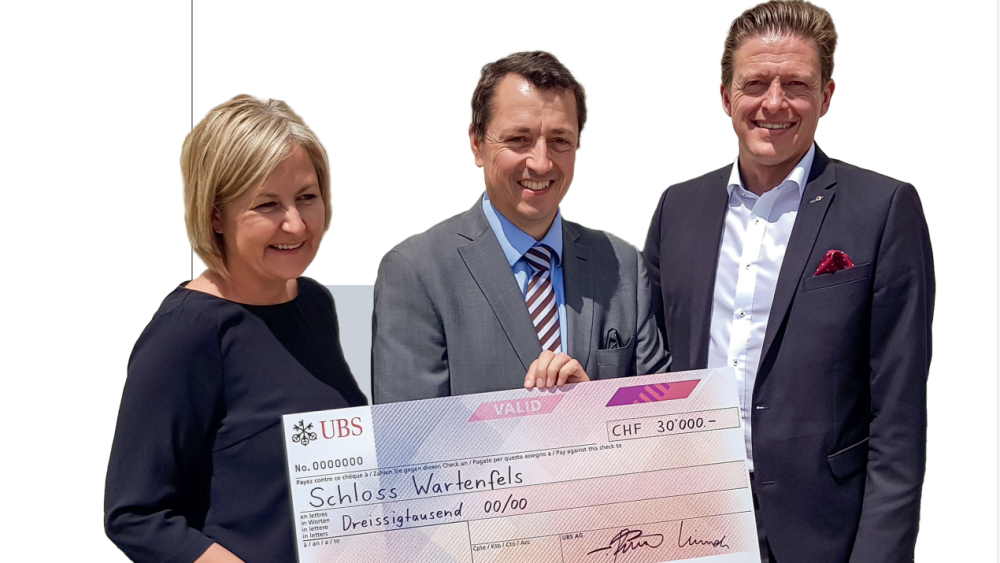 Bei unserem Schloss stehen in den nächsten Jahren umfassende und kostspielige Sanierungsarbeiten an. Der Unterhalt des Schlosses wird im Normalfall vom Kanton Solothurn (47%) und den beiden Trägergemeinden Lostorf (35%) und Olten (18%) getragen. Um namentlich die beiden Trägergemeinden finanziell zu entlasten, wurde ein Fundraising Projekt gestartet. Zahlreiche Stiftungen haben inzwischen einen namhaften Beitrag zugesagt. Auf dem Bild ersichtlich ist die Checkübergabe der UBS Kulturstiftung an den Stiftungsrat Schloss Wartenfels.
